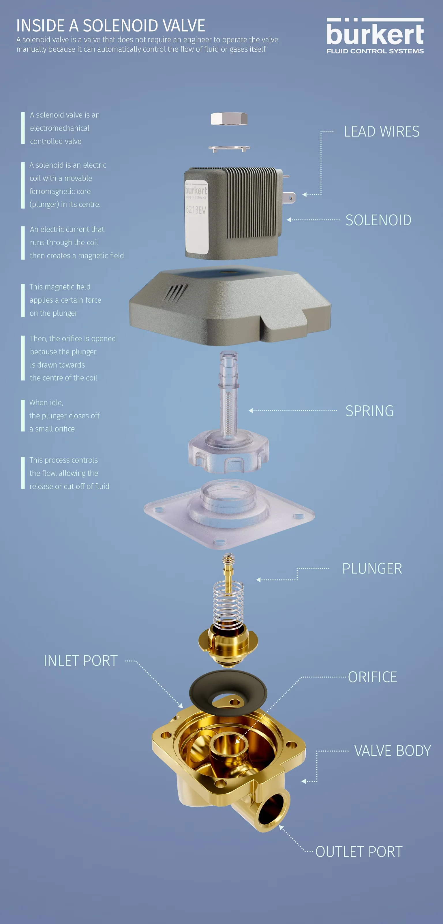 โซลินอยด์วาล์วคืออุปกรณ์ไฟฟ้าเครื่องกลที่ใช้สำหรับควบคุมการไหลของของเหลวหรือก๊าซ ความแตกต่างหลักจากวาล์วแบบดั้งเดิมคือวิธีการทำงาน โซลินอยด์วาล์วมักใช้พลังงาน 12V DC ซึ่งคล้ายกับแบตเตอรี่ AA และสามารถทนแรงกดสูงสุดถึง 1200 psi ทำให้เหมาะกับการใช้งานในหลายสถานการณ์ ตั้งแต่การควบคุมการไหลของน้ำในตู้ปลาไปจนถึงการใช้เป็นเซ็นเซอร์ในการตั้งค่าในอุตสาหกรรมต่างๆ หนึ่งในตัวอย่างของโซลินอยด์วาล์วที่ได้รับความนิยมคือ โซลินอยด์วาล์วจากแบรนด์ BURKERT ซึ่งเป็นอุปกรณ์สำคัญในการควบคุมการไหลของของเหลวหรือก๊าซด้วยความแม่นยำสูง